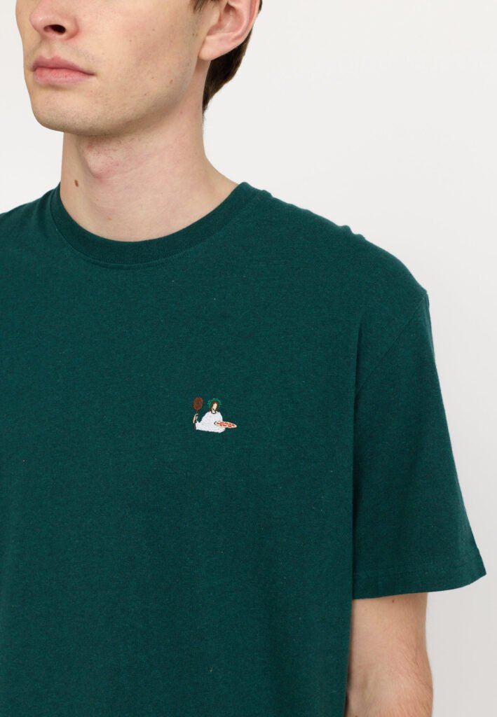Référence Application T-shirt / 1425 PIZ – Dark Petrol Matière 100 % coton biologique mélangé Grammage 200 g/m² Coupe Loose fit – tombé ample et moderne Détail graphique Broderie fun et colorée poitrine Finitions Col rond côtelé, ourlet double aiguille Entretien Lavage à 30 °C à l’envers recommandé Origine Fabriqué en Inde selon standards responsables Saison Printemps à mi-saison